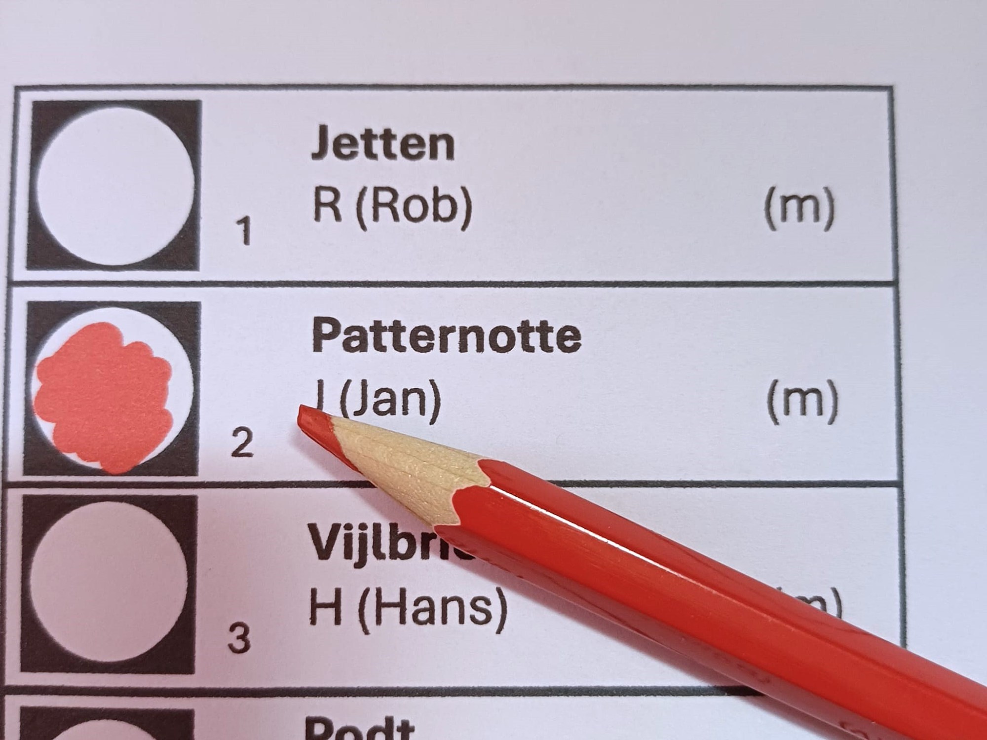 Les électeurs néerlandais votent avec un crayon rouge en coloriant le rond devant le nom du candidat qu’ils choississent